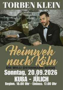 Torben Klein geht mit dieser Revue jetzt auch auf Tour. Genießen Sie eine Show voller Gassenhauer und Geschichten, wie zum Beispiel „Einmal am Rhein“, „Heimweh nach Köln“, „Villa Billa“ und noch viele weitere Hits. Wo sonst eine 10köpfige Big Band auf der Bühne steht, bietet Torben Klein ihnen jetzt hautnah tiefe Einblicke in die Hits von Willi Ostermann. Doch er kommt nicht ganz alleine, denn mit Domhätzje Nadine bringt er seine Duett Partnerin des Klassikers „Kölsche Mädcher künne bütze“. Die beiden werden für das ein oder andere Duett gemeinsam auf der Bühne ihre Stimmen verschmelzen lassen. Freuen Sie sich auf eine stimmgewaltige Show alter Klassiker. Erleben auch sie einen unvergesslichen Abend, der zum swingen, schunkeln und mitsingen einlädt.