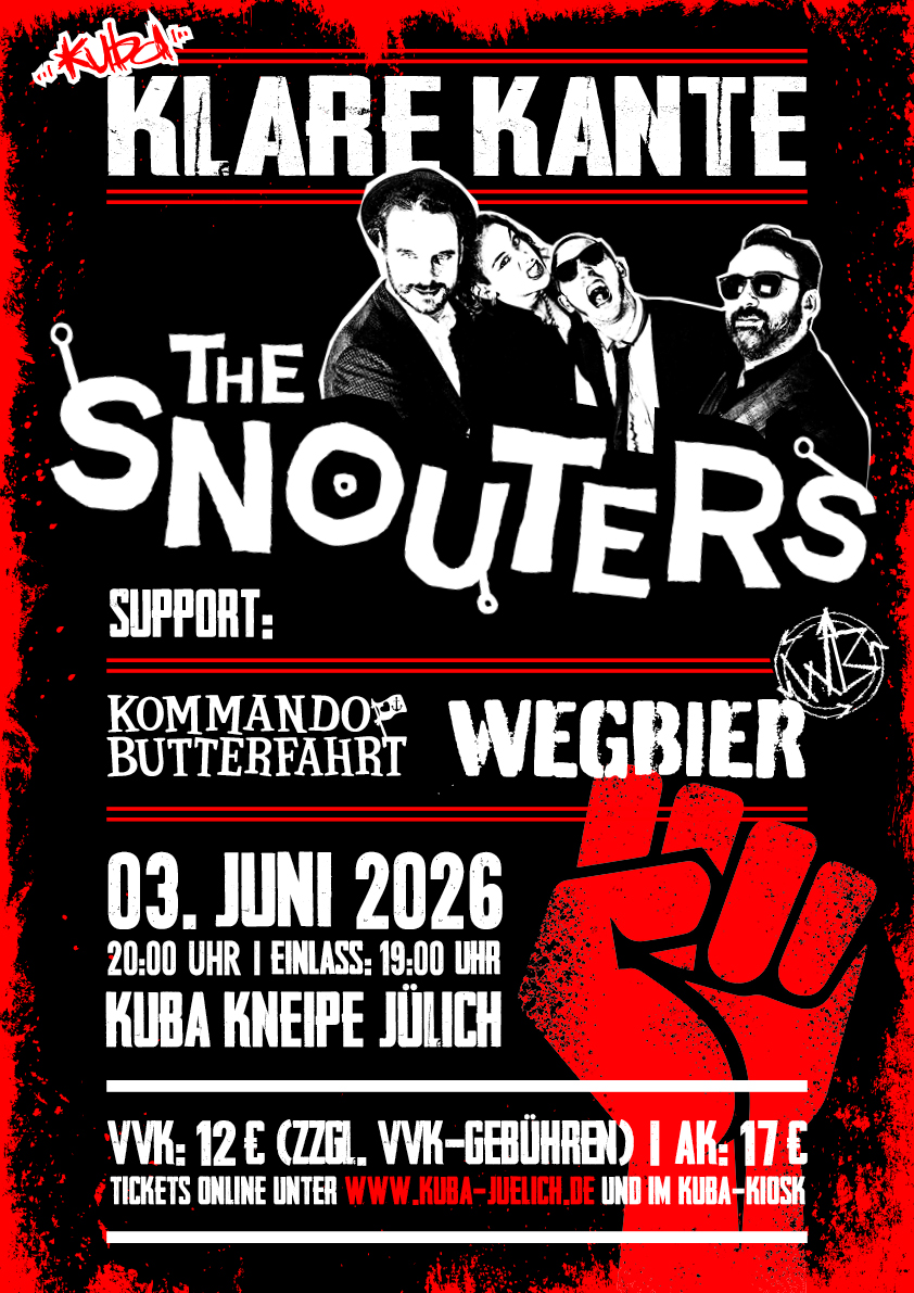 Am Mittwoch, 3. Juni 2026 heißt es wieder ab 20 Uhr „Klare Kante!“ im Jülicher Kulturbahnhof, wenn die 3 Bands The Snouters, Kommando Butterfahrt und Wegbier die Bühne in der […]