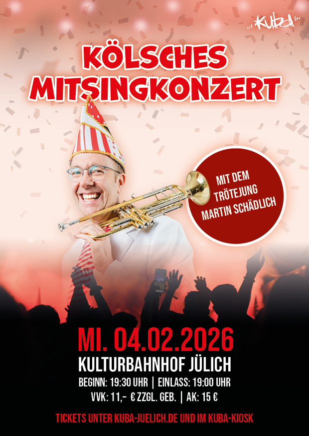 Das Team vom KUBA Jülich und der Trompeter Martin Schädlich laden herzlich ein zum „kölschen Mitsingkonzert“ am Mittwoch den 4.Februar. Mitsingabende im KUBA erfreuen sich großer Beliebtheit und mit dem […]